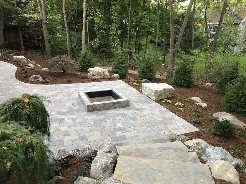 Take a walk through this patio installation with custom-designed water and fire features.
